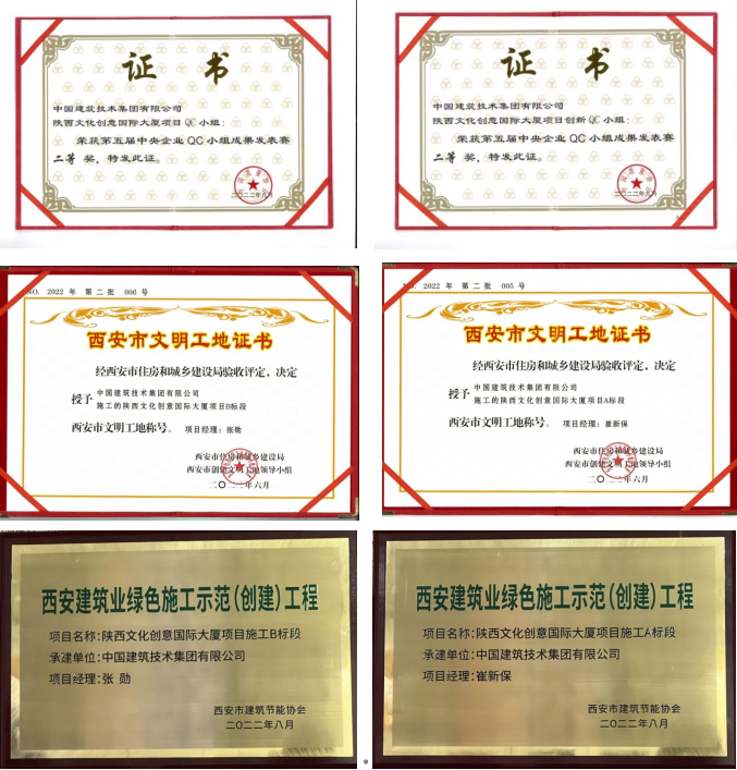此前,陕西文化创意国际大厦项目QC小组曾在第四届中央企业QC小组成果发表赛中荣获三等奖。两年间,小组成员共计完成4项课题,并在西安市发表赛中斩获一等奖3项、二等奖1项。在QC小组驱动下,文创项目也积极评优,相继荣获“西安市文明工地”“西安建筑业绿色施工示范工程”等多项奖项。