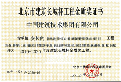 近日,集团公司智能化部于2019年1月承建的亚投行永久办公场所项目数据机房工程荣获2019-2020年度北京市建筑长城杯工程金质奖。长城杯金质奖为北京市建筑工程质量最高荣誉奖,评选由两部分组成,一是通过初评小组组织初评检查推荐,二是市建筑评委会评审表决,该评选对建筑结构有着极其严格的要求,工程质量必须达到设计要求和相关规定。