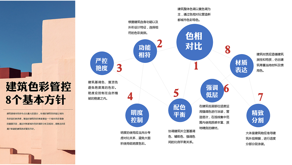本项目位于四川省成都市新都区,区域面积496 平方千米,城市人口规模约90万人。制定新都区城市色彩导则,依托色彩导则制定户外广告导则、 城市外摆导则、导视系统设计导则,规范城市建设及城市发展过程中的精细化管控。项目于2020年8月启动,历时6个月完成所有工作并取得验收。