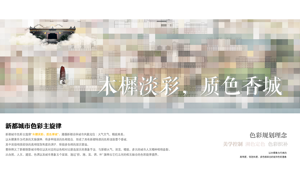 新都区城市容貌提升,是在公园城市建设背景下,追溯城市文脉、梳理城市色彩基底、寻找城市主调,以城市色彩为核心,开展的系统性城市形象识别系统提升。创新执行的城市色彩、户外外摆、户外广告、户外导视系统,将城市以点、线、面的方式,全系统覆盖,通过综合性的治理体系及样板段示范,建立可实施可落地的管控引导。